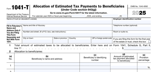 This all makes sense to Igor, and he discovers that the process for making this allocation is fairly straightforward. There is a simple form for it: Form 1041-T, Allocation of Estimated Tax Payments to Beneficiaries. The form must be filed by the 65th day after the close of the trust’s tax year. This lines up with the deadline to make 65-day distributions to beneficiaries under Code Section 663(b), about which Igor had already read a very informative and enjoyable article not too long ago. This is logical, because it matches the trustee’s ability to allocate estimated payments to a beneficiary with the ability to make distributions after the trust’s year-end to carry out taxable income from the trust. Here is what the top of the form looks like for reference: