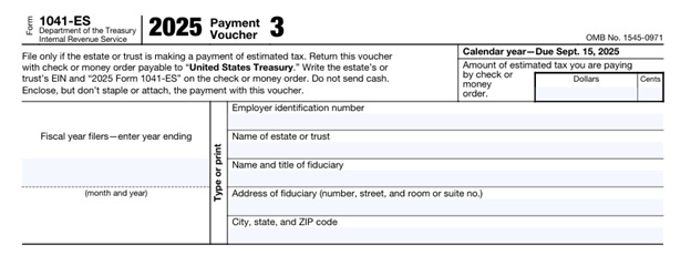 Moving on to the mechanics, the statute provides that the estimated tax be paid, as for individuals, in four installments by the following dates: April 15th, June 15th, September 15th, and January 15th of the next year. 26 USC 6654(c). Estimates are paid using form 1041-ES, which looks like this (editor’s note: with some changes in manner of payment for 2026 to be discussed below):